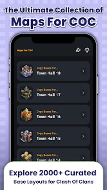 แผนที่สำหรับ Clash of Clans Base Layouts 2025 เป็นแอปพลิเคชันที่ใช้งานง่ายออกแบบมาสำหรับผู้เล่น Clash of Clans ที่ต้องการพัฒนากลยุทธ์การเล่นของตน ด้วยการเข้าถึงฐานข้อมูลที่คัดสรรมาอย่างพิถีพิถันมากกว่า 2,000 แบบ ผู้ใช้สามารถคัดลอกฐานสงคราม ฐานฟาร์ม ฐานถ้วยรางวัล และฐานไฮบริดได้โดยตรงเข้าสู่เกมของตนด้วยการแตะเพียงครั้งเดียว แอปนี้รองรับทุกระดับ Town Hall ตั้งแต่ 4 ถึง 18 และระดับ Builder Hall ตั้งแต่ 4 ถึง 10 ทำให้มั่นใจได้ว่ามีตัวเลือกมากมายสำหรับผู้เล่นในทุกช่วงของการเดินทางใน Clash of Clans ของพวกเขา